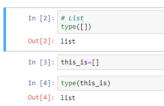 - ৩ নং ইনপুট সেলে, ভ্যারিয়েবলে Square Bracket রেখে কোড রান করলাম, অ্যাসাইনিং হয়ে গেলো। মানে, this_is = [ ] অর্থাৎ, this_is আর [ ] একই জিনিস এখন।