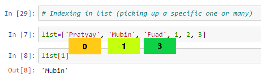 এবার আমরা শিখবো Index করা। এর কাজ হলো লিস্ট এর একটা বা তার বেশি যে এলিমেন্ট গুলো আমরা পিক করতে চাচ্ছি, ঠিক সেটাই বা সেগুলোই পিক করা বা তুলে আনা।