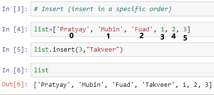 - ৫ নং ইনপুট সেলে, আমরা 3 নং পজিশনে নতুন এলিমেন্ট Takveer insert করবো, সেজন্য list ভ্যারিয়েবলের পর .insert( ) ফাংশন ব্যাবহার করে Bracket এর ভেতরে এলিমেন্ট এর পজিশন 3 এর পর কমা দিয়ে এলিমেন্ট Takveer রাখবো। তারপর কোড রান করলাম।